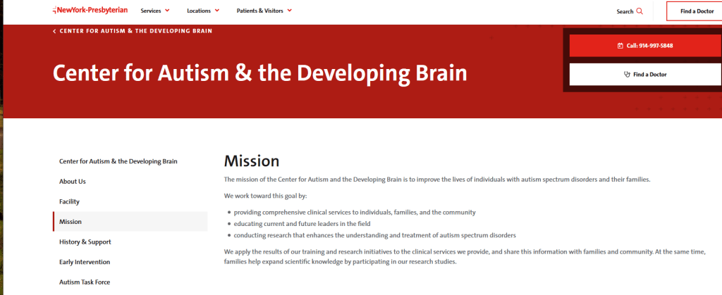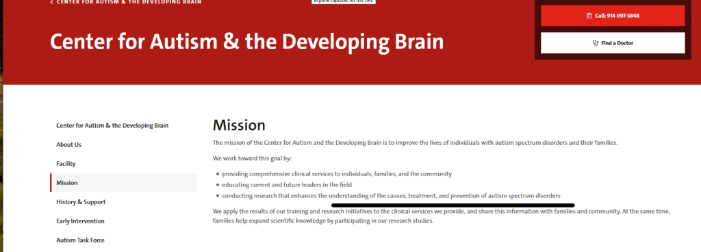 Image from a cashed version of the Center for Autism &the Developing Brain mission statement with the phrase ” understanding of the causes, treatment, and prevention of autism spectrum disorders” underlined
